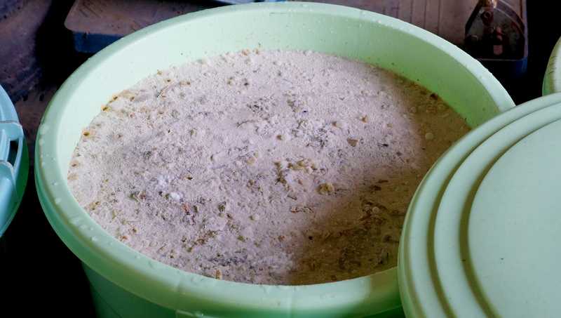 手作りの乳酸発酵ごはん。毎日地域の病院や福祉施設から回収してきた野菜くずや、作り過ぎて余ったごはんに砕米を加えて一晩炊き上げます。その後、植物性の乳酸菌を加え3~4日置くと、豚達の大好きな主食、乳酸発酵ごはんの出来上がり。 おやつは、放牧場の草や、木の実、土中の生物や微生物、ミネラルを自分達で探して食べています。これらの心身ともに満たされた食事は、豚達の腸内環境を整え、免疫力を高めます。その結果、抗生剤などの投薬や、過度な殺菌消毒、*ワクチンに頼らずとも病気に負けない健康な豚に育ちます。※2023年9月、九州全県で豚熱のワクチン接種がはじまりました。味菜自然豚には、引き続き「豚熱」以外のワクチン接種はしておりません。